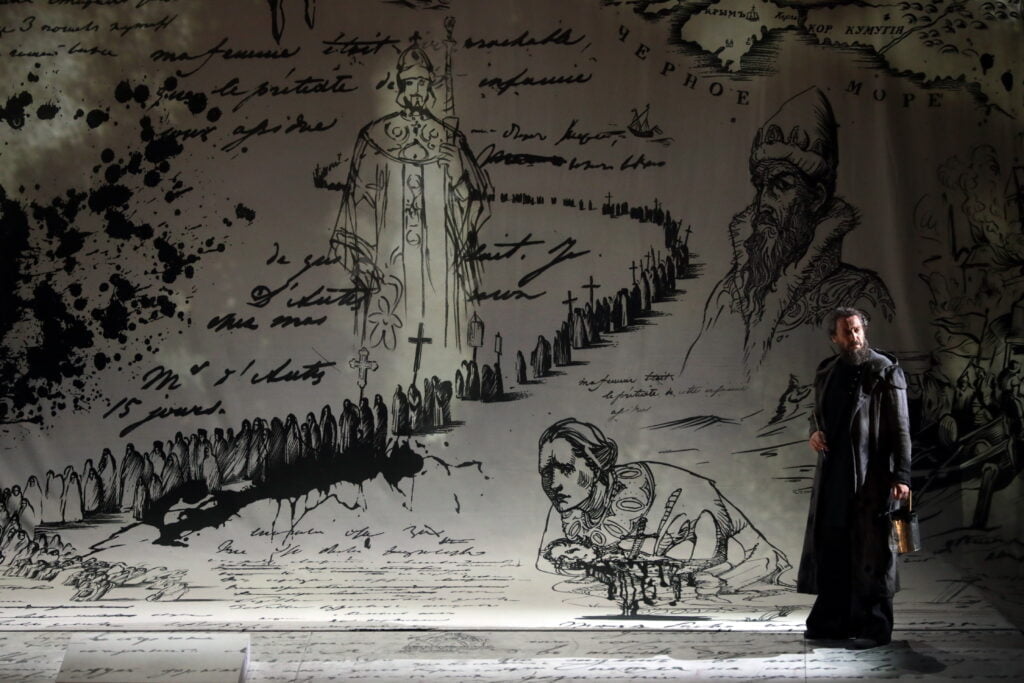 Unfortunately, what we got to see was not of the same level as what came to us through hearing. The stage setting is dominated by a huge parchment symbolizing the flow of history; various characters write their version of the facts on it. It is the chronicle of Pimen, constantly censored by the establishment.