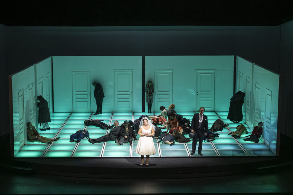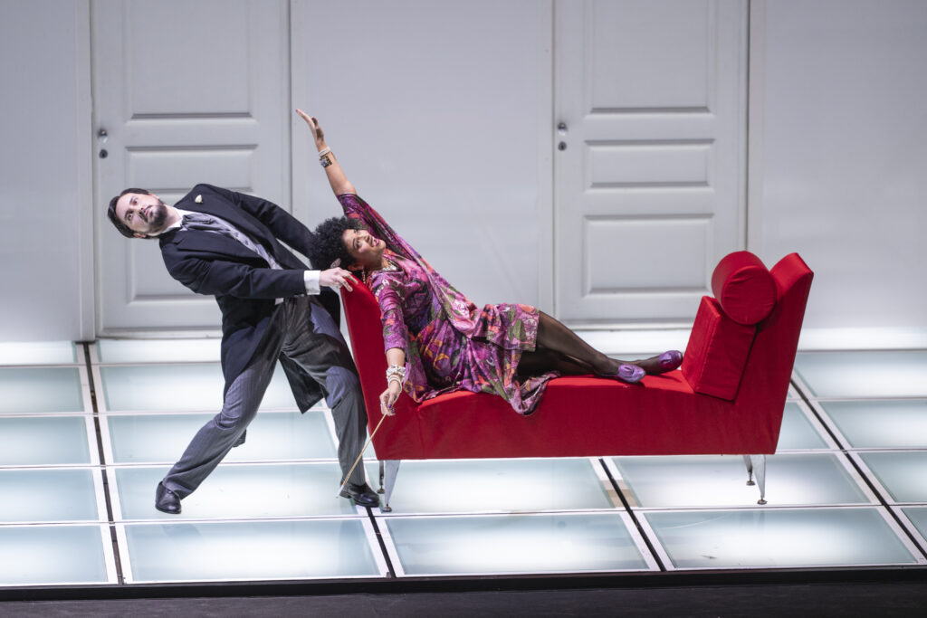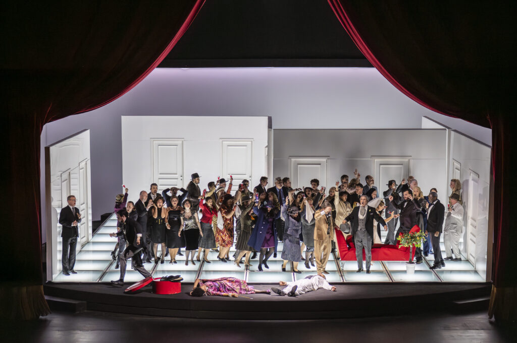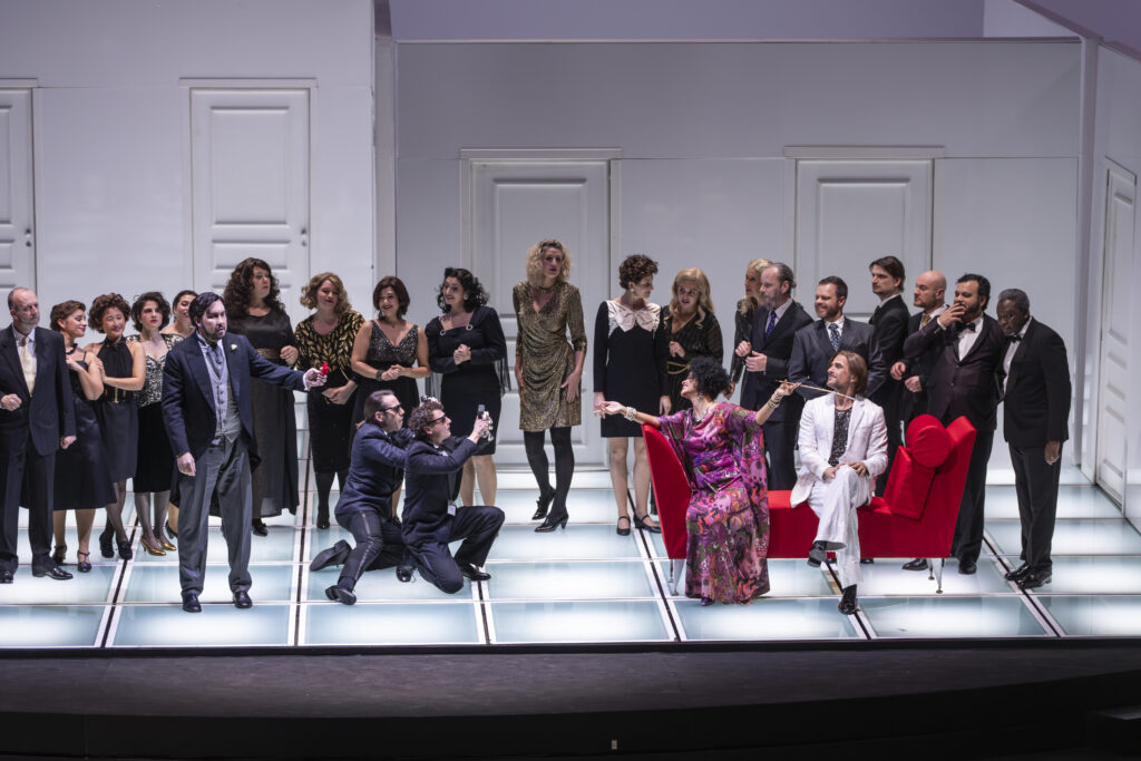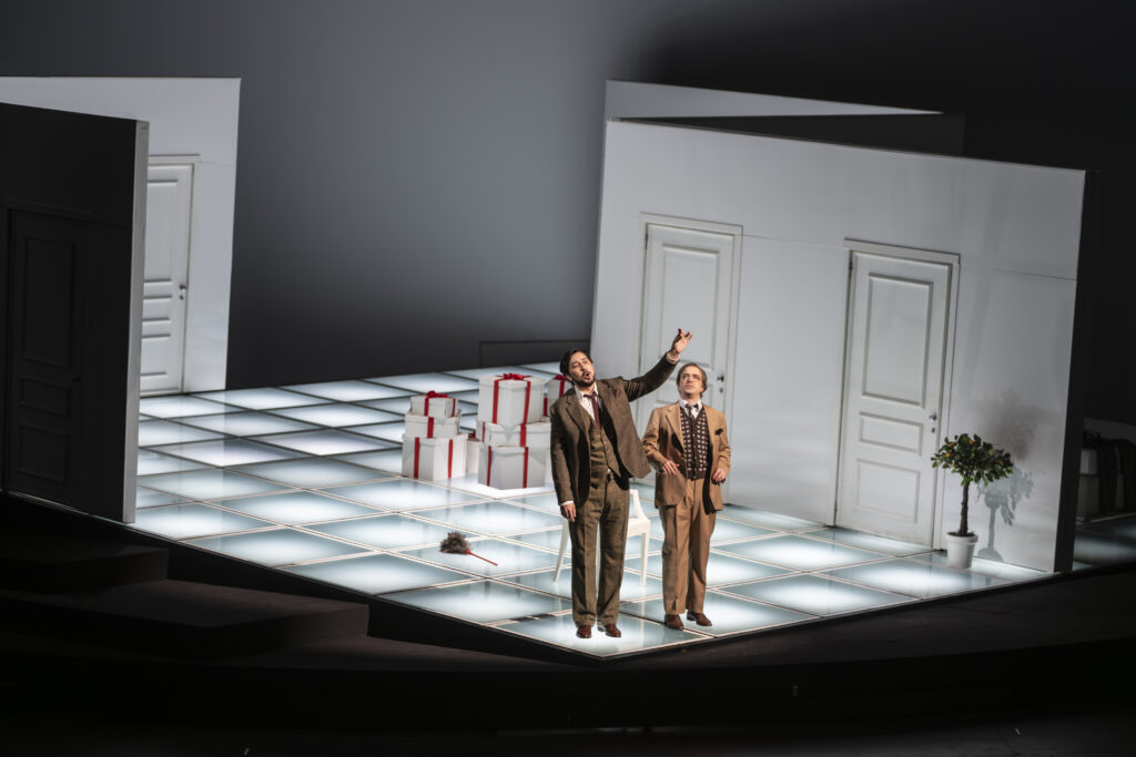 Damiano Michieletto sets all this in a sloping, rotating set by Paolo Fantin. This set transports us from one place to another. It is a minimalist set with all the necessary doors and a few essential props, such as an orange tree that sheds and regrows its leaves. Above all, as always in his productions, he gives the adventure a flawless tempo sostenuto. He has a knack for attitudes, gestures, tics, and placements that reveal the characters and situations they are in. The production is also beautiful, thanks particularly to Silvia Aymonino’s costumes and Luciano Novelli’s lighting. Exciting, funny, and beautiful!