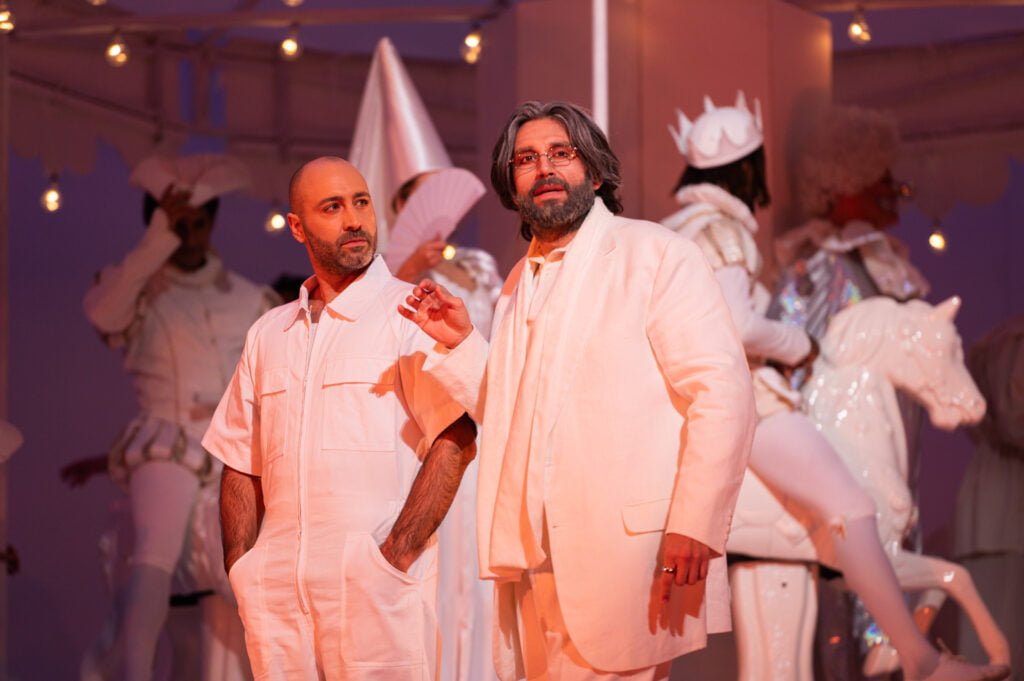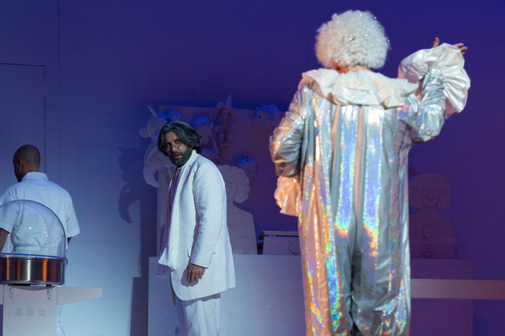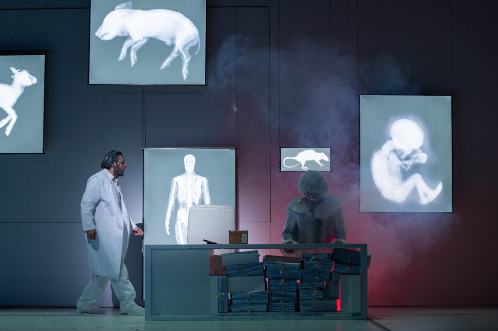 La regia dello spettacolo è stata affidata a Simon Stone, coadiuvato da Mel Page (scene e costumi) e James Farncombe (luci). Il regista australiano, noto per le sue “riletture provocatorie”, ha proposto una messa in scena che ha suscitato più di una perplessità. L’impressione generale è che Stone abbia voluto “alleggerire l’atmosfera”, inserendo elementi dissonanti che nella maggior parte dei casi risultavano semplicemente fuori posto. Il primo quadro (“Prologo in Cielo”) si presentava come completamente bianco, con i coristi disposti ordinatamente su diverse file, vestiti pure di bianco. Al centro troneggiava una scala a chiocciola, utilizzata da Mefistofele per il suo ingresso in scena (forse l’ascensore era momentaneamente fuori servizio!). Se questo ricorso al bianco poteva avere un senso nella scena in cielo, risultava quanto meno fuori posto nel primo atto, dove similmente costumi, fondale ed elementi scenici (una giostrina e alcuni chioschi) erano tutti completamente bianchi. Anche lo studio di Faust risultava bianco, con le pareti riempite da una serie di “foto-radiografie” di animali decisamente più adatte ad un veterinario che ad un medico! Il giardino del secondo atto era in compenso sostituito da una piscina di palline colorate, nella quale i personaggi si tuffavano sparendo dalla vista.