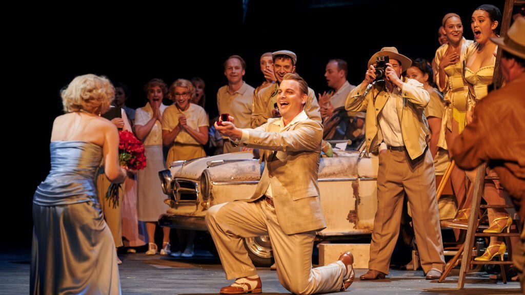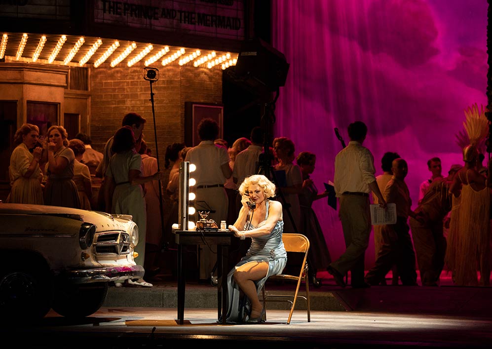 De cinema rijdt weg en maakt plaats voor de filmstudio. De Prins zit in zijn cabrio met achter hem bewegende beelden van rijdende auto’s. Een productieassistent laat met zijn voet de cabrio schommelen, de regieassistente die met de filmklapper op de motorkap ligt laat zich na iedere CUT overijverig van de auto op de grond rollen. Het stereotype, rokende regisseur (Jager) met hoge bloeddruk, geruite pet en bril, clasht met de verwaande filmster. Jurken, bloesjes, kapsels uit de fifties. De wereld van de film, fabriek van onze dromen en illusies. Suikerzoet, zuurstokroze, schitterende strass, waar Marilyn Monroes en Jayne Mansfields rondlopen, met voluptueuze boezem in gebeeldhouwde jurken. Waar sprookjes waar worden! Prins valt als een baksteen voor de getransformeerde Rusalka: romance on a ladder, bloemen, applaus, paparazzi, signeersessie. Even hard valt hij prompt voor de vreemde Prinses: seks, drugs, oppervlakkigheid. Als hij tot bezinning komt en Rusalka achternagaat, is de vloek al in werking getreden, hij ziet dat ook haar wereld voor hem ontoegankelijk is (uitgebeeld door freeze en slow motion van de mensen op straat) en stort in het ongeluk. Kortom, hij valt en valt, tot het moment dat hij ten hemel stijgt op een schommel van bloemen, de dood in gekust en verlost door zijn onbereikbare geliefde.